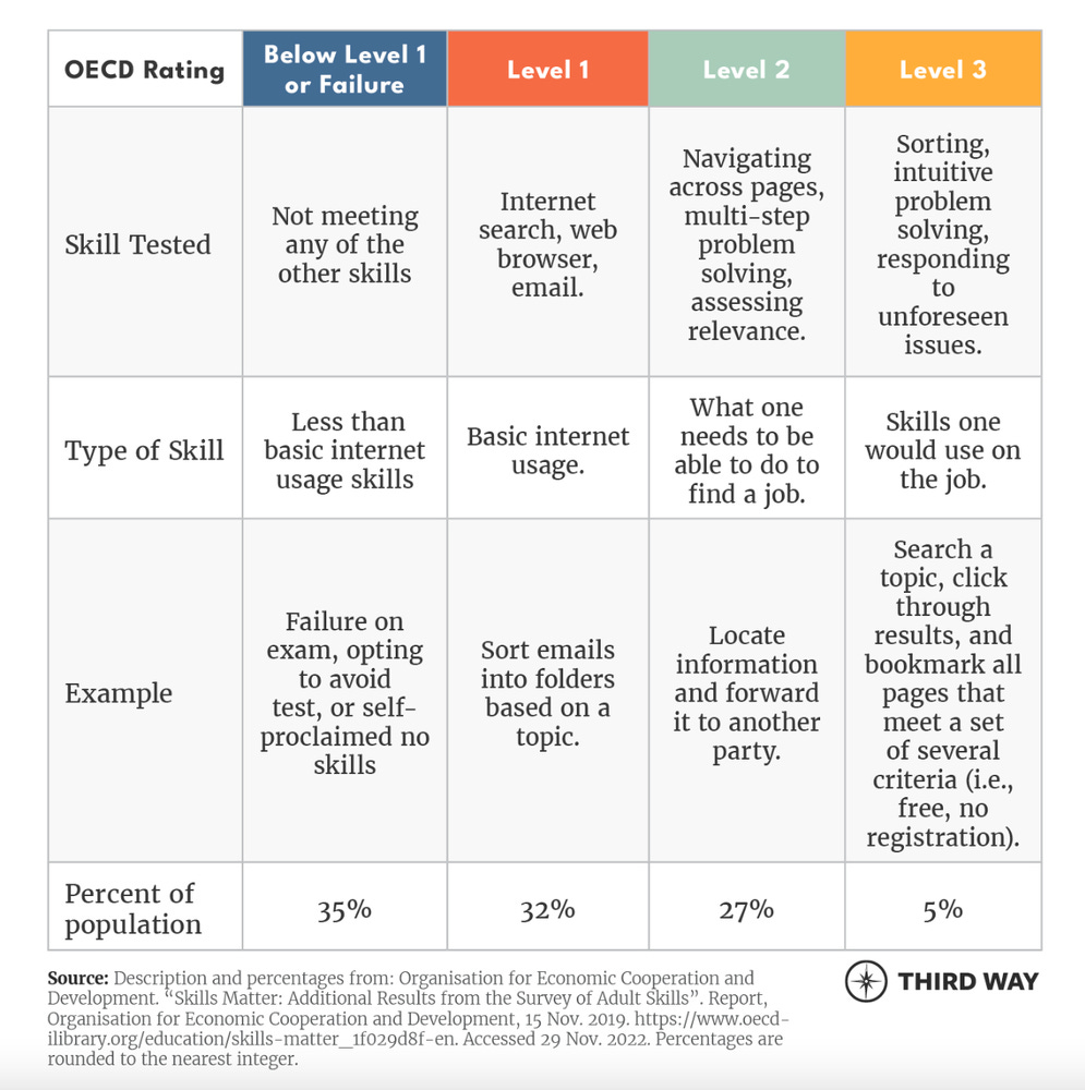According to this OECD report, in 2019, 67% of American adults lacked the skills needed for finding a job online, which involve advanced internet navigation, problem solving and critical understanding of information. On the other end, another study showed that 79% of Americans used social media this same year.