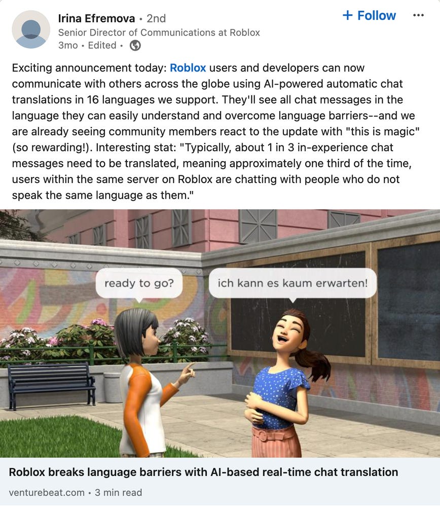 The news that triggered these thoughts came from Roblox. Indeed, last year, the company released an AI-based real-time chat translation. The game, extremely popular among children across the world, now enables them to communicate seamlessly despite speaking different languages.